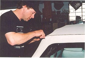Danny started out working for Tommy's Auto Upholstery and soon was being specified by fussy car owners, as the one person they wanted to work on their cars. After a time, Danny decided that he would be happier working for himself, and opened Victoria Auto Upholstery. I went to see Danny about replacing the top before the Spring Spectacular car show. I was able to book him for May 23rd, after he had completed reupholstering the Budget "double-ended" car for the Victoria Day Parade. |